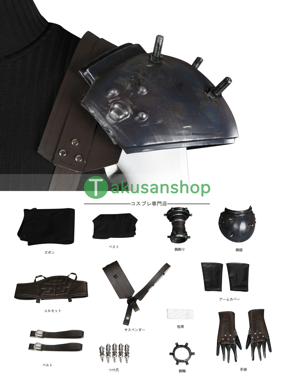【セット内容】:ズボン、ベスト、腕飾り、肩鎧、コルセット、サスペンダー、手袋*2、アームカバー*2、包帯、腕輪、爪、ベルト