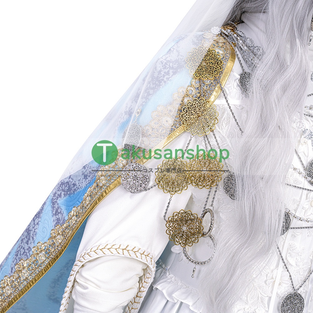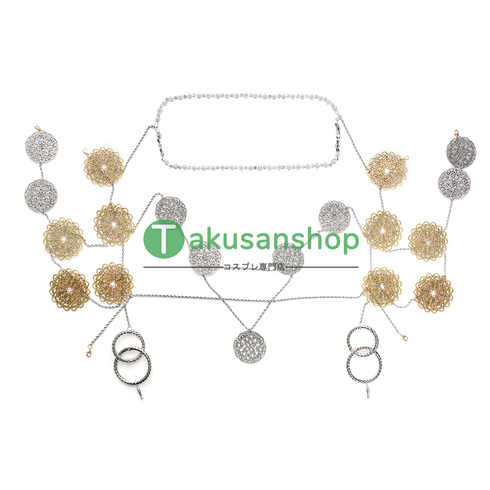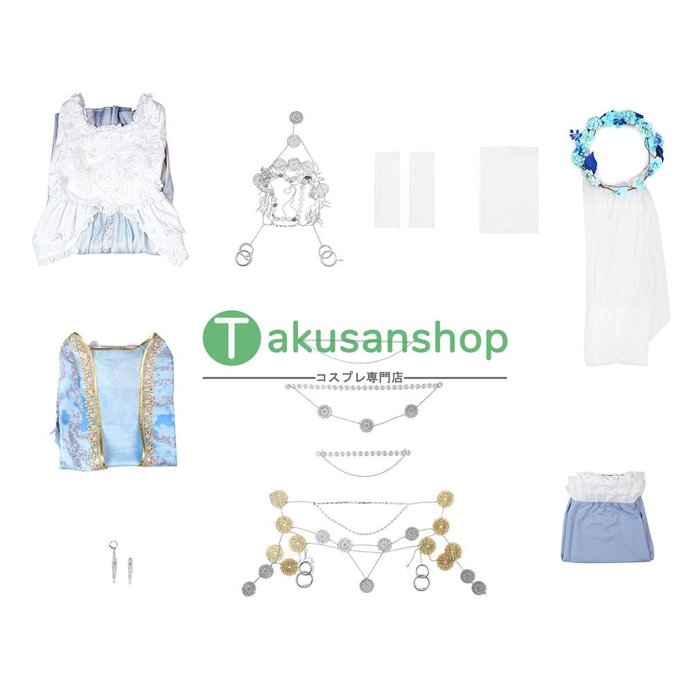 【セット内容】:ワンピース 、頭飾り、アームカバー*2、襟、花輪、マント、ネイル*2、チェーン*4、ズボン